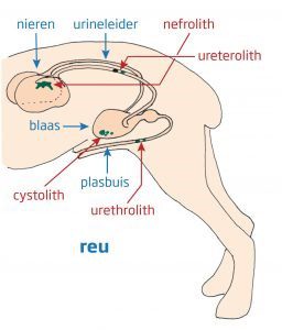 Figuur 1: Urinewegen van de reu. Zo lang de steentjes in de blaas zitten en niet in de plasbuis, geeft het irritatie maar kan de hond nog wel gewoon plassen.