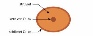 Figuur 3: Samengestelde blaassteen van calciumoxalaat en struviet. De kern bestaat uit calciumoxalaat, daar is het mee begonnen. Door irritatie van de blaas door dit steentje kan een infectie optreden met als gevolg vorming van struviet rond de kern. Door een behandeling met antibiotica wordt de infectie verholpen waarna de vorming van calciumoxalaat verder gaat. In dit geval is het primaire probleem de vorming van calciumoxalaat. Na verwijderen van de steen moeten daartegen preventieve maatregelen worden genomen.